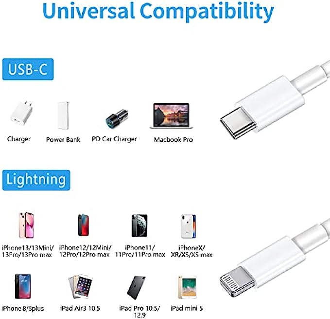 【PD Fast Charging and Data Transfer】Ximytec USB-C to lightning cables support power delivery fast charge for iPhone 13/13Pro/13ProMax/13Mini/12/12Pro/12ProMax/12Mini/11/11Pro/11Pro MAX/XS/XS MAX/XR/X/8/8Plus/iPad 8th/2020/Pro 12.9" gen1/Pro 12.9" gen2/Pro 10.5"/Air3 10.5"/mini5 7.9"(Note:You need to use 20W or above USB-C Power Adapter to achieve fast charge).These lightning cables also supports data transmission up to 480Mbps.