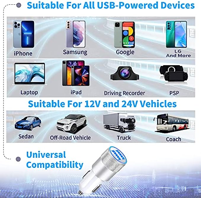 【Premium Materials and Design】: The housing made of an aluminum alloy + ABS fireproof materials offers better scratch resistance, heat dissipation, attractive design, and long service life, suitable for the most untouched vehicle interiors. Gold-plated tubing reduces heat during charging while maximizing charging speed and efficiency. The ring LED indicator can help you to find the charging ports easily in the dark, Easily fits in a car cigarette Lighter socket with limited space.