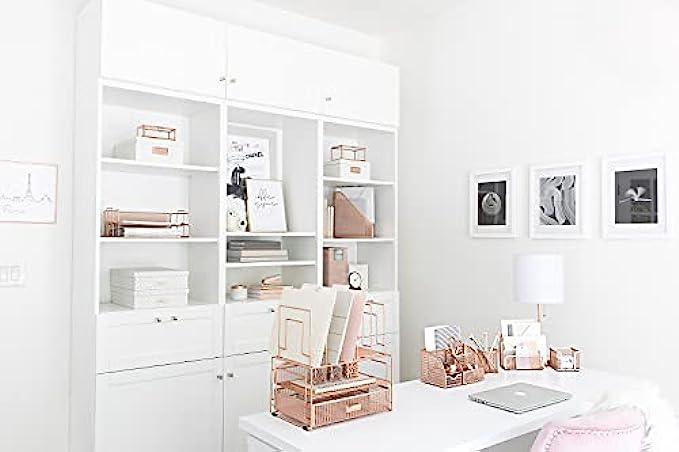 PREMIUM QUALITY: Made of strong metal mesh and finished with rose gold paint, this File Organizer looks great on any desk! This all in one inbox organizer caddy will look great on a desk while also offering functionality and a modern look.