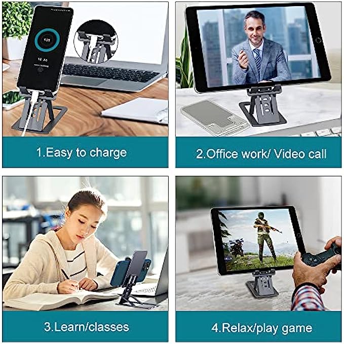 • ?【Anti-slip Fixing】The back and grooves of the mobile phone stand are designed with non-slip silicone pads, and there are four non-slip rubber pads at the bottom of the stand, which can ensure that your phone or tablet is fixed on the desktop, preventing sliding and allowing you to tap the screen easily, No need to worry about your phone tipping or dropping.