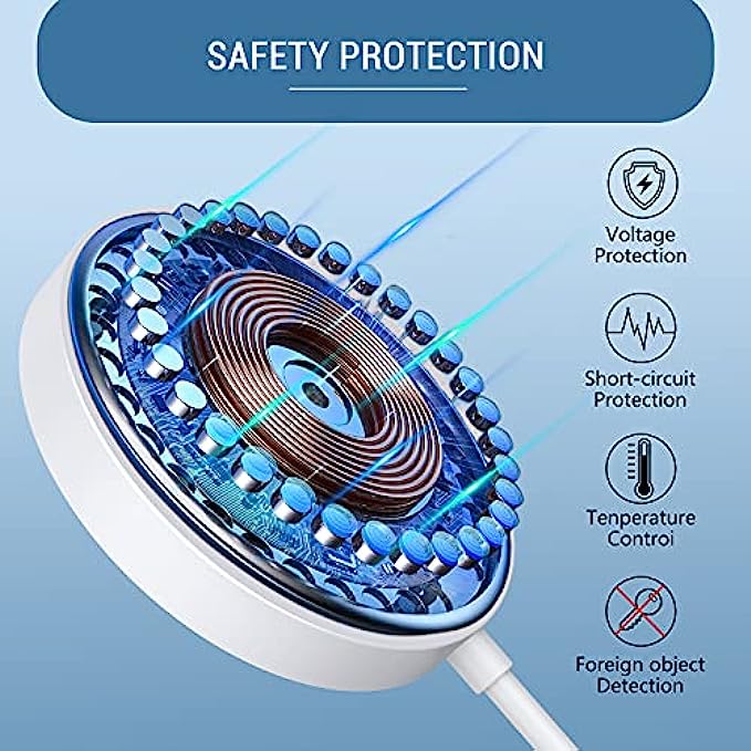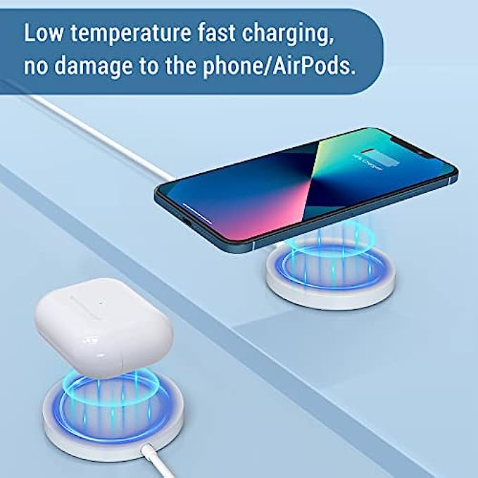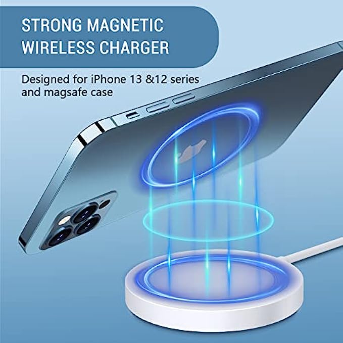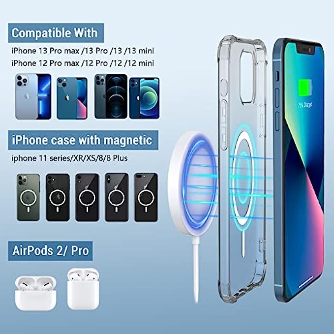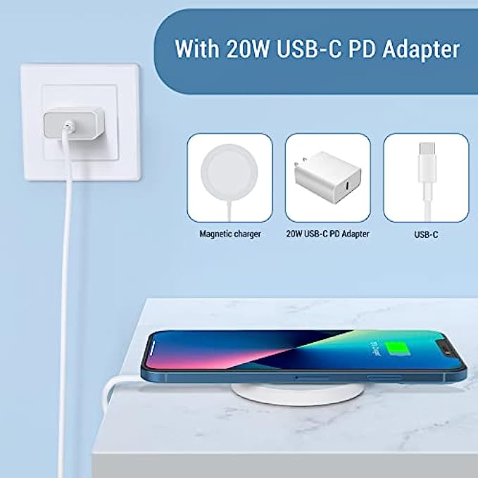 【Specifically for iPhone 13/12 Series】With New magnetic technology makes wireless charging a snap. Perfectly wireless charging pad compatible with magsafe charging for iPhone 13,13 Pro,13 Pro Max,13 mini; iPhone 12, iPhone 12 Pro, iPhone 12 mini iPhone 12 Pro Max.Up to 7.5W secure wireless charging. And with models of AirPods Pro /3 & 2 with a wireless charging case. 【Optimal Charging with 20W Adapter】 A 20W USB C charger block will come with this magnetic wireless charger to meet the best charging result. The product charging time is just 3-3.5 hours. Iphone Magnetic charger works like the original and can be used with a professional Magnetic Clear case to charging other QI Enable Devices like iphone 11/pro/max /iphone X and etc. If your phone case isn’t made with Magnetic, please remove it for charging. 【Superior Safety】The Qi certificated wireless magnetic phone charger prevents the charger and your phone from overcharging, over current, over voltage, over heating, and short circuit. Provides you with a better and safer charging experience.The optimized magnetic design makes charging easier , improving energy conversion and reducing heat while charging. 【Entertainment Companion】Mag safe charger design wireless charging pad make hassle-free and enable you to play games, watch movies & videos, Face Time, pick up to check emails or messages from any angles.With 3.3ft long cable allows you to freely operate the device and juice up your phone simultaneously at home, in the office or car anytime. 【Portable & Travel Companion】Lightweight and compact design wireless charging station is quite smaller than other desk wireless chargers, it can be put in pocket ,shoulder bags, handbags, travel bags. Package includes :1 x Magnetic Wireless Charger, 1 x USB-C cable, 1 x 20W PD Fast wall charger, 1 x User Manual.