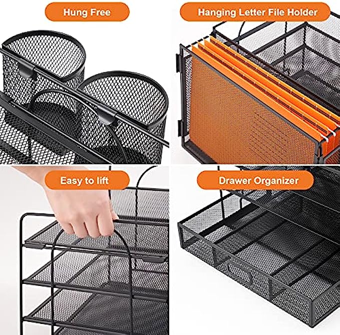 【Perfect Desktop File Organizer】Our Office Desk Supplies Organizer is made of 4 sliding trays + 2 Hanging Pencil Holders + 1 sliding drawer which has enough storage space to accommodate all office supplies, such as pens, pencils scissors, folders and Letter/A4 Size Paper