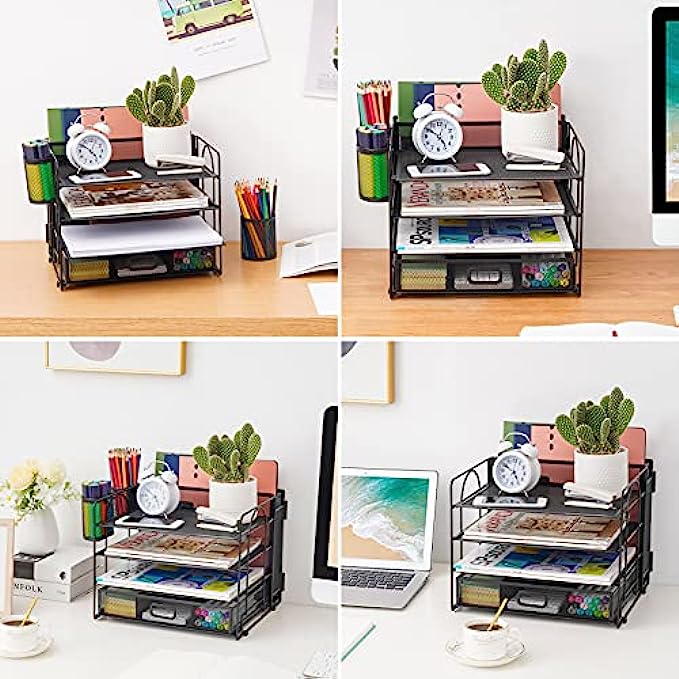 Marbrasse 4-Trays Desk File Organizer with 2 Pen Holder, Desktop Hanging File Holder with Drawer, Paper Letter Tray Organizer, Mesh Office Supplies Desk Paper Organizer for Home Office (Black)