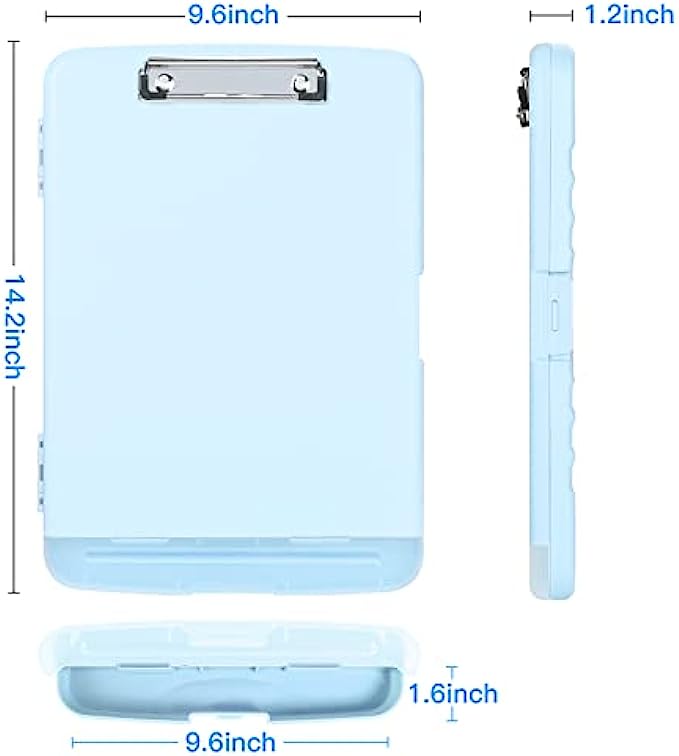 【Clipboard with Storage】This clipboard includes 2 compartment, One for storing A4 paper, book, invoices, paperwork and more, the other for holding pens, pencils, rules, paper clips etc. Clipboard size: 9.6 x 14.2 x 1.2 inch, Paper compartment size: 9.6 x 12.5 x 1.2 inch, Pen compartment size: 9.6 x 1.3 x 1.2 inch.