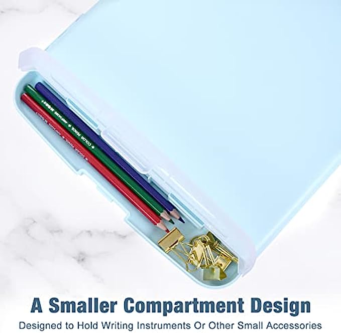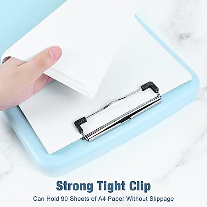 【VERSATILE Clipboard】The clipboard surface is smooth, Perfect for writing. The Heavy Duty Low Profile clip can hold 50 sheets of paper. 1.25 inch storage compartment can hold A4 size paper ups to 150 sheets. It also has a separate compartments for pencil or pen. Base latch that stays securely closed so your papers stay put and won't get damp.
