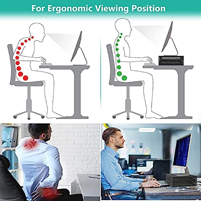 Ergonomic: Raise TV, monitor or laptop by 4.7 inches off the desktop to create a comfortable viewing position and a better healthy sitting position which help reduce stress on the neck and back.